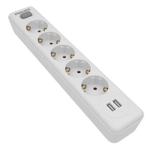 PHILIPS πολύπριζο SPN3052WA, 5x schuko 16A, 2x USB 2.4A, 2m, λευκό Πολύπριζο ρεύματος της Philips με 5 πρίζες schuko για την τροφοδοσία των ηλεκτρικώ …