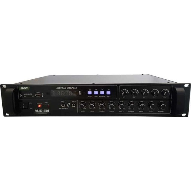Audien M15600/180 Μίκτης ενισχυτής 5 ζωνών με ισχύ 180 Watt RMS & 6 εισόδους. Επιλογή λειτουργίας 100V/70V/4-16Ω, με ενσωματωμένο multimedia USB - MMC player, FM Tuner και Bluetooth. Διαθέτει 2 εισόδους μικροφώνου, 2 εισόδους AUX και μία έξοδο LINE-OUT. Επίσης Διαθέτει 5 ζώνες με ξεχωριστό έλεγχο έντασης για κάθε ζώνη, Ανεξάρτητη ρύθμιση έντασης ήχου για κάθε είσοδο, Ρυθμιστικά bass, treble και master volume.