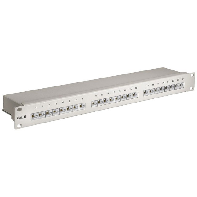 Patch panel κατηγορίας CAT 6 STP, 24 θυρών σε γκρι χρώμα.